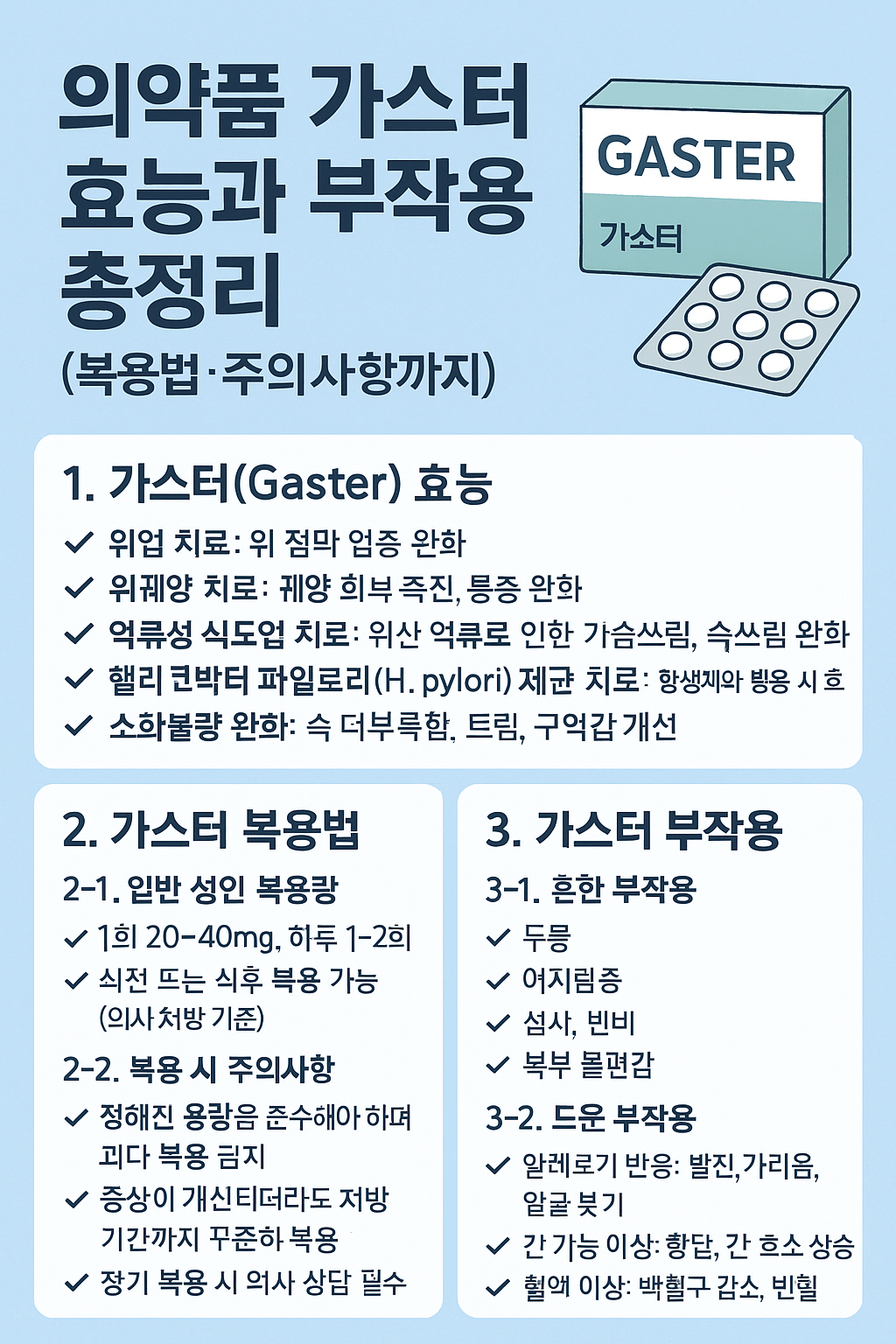 가스터는 위장 관련 질환을 치료하기 위해 널리 사용되는 약으로, 주로 위염, 위궤양, 역류성 식도염 등에 처방됩니다. 이 글에서는 가스터의 효능, 복용법, 부작용, 주의사항을 한눈에 볼 수 있도록 정리했습니다.